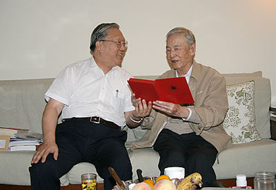 今年是新中國成立60周年,也是中國科學(xué)院建院60周年。9月10日和11日,全國人大常委會副委員長、中國科學(xué)院院長路甬祥先后看望了60年來為我國科技事業(yè)和中國科學(xué)院的發(fā)展做出重要貢獻(xiàn)的原黨組書記、副院長張勁夫,原黨組書記、主席團(tuán)執(zhí)行主席、副院長李昌,原中央紀(jì)委駐院紀(jì)檢組組長鐘炳昌和原副院長葉篤正、胡啟恒,代表院黨組和全院科技工作者向老領(lǐng)導(dǎo)們致以親切的問候和良好的祝愿,并為他們送去了中科院建院60周年紀(jì)念章。