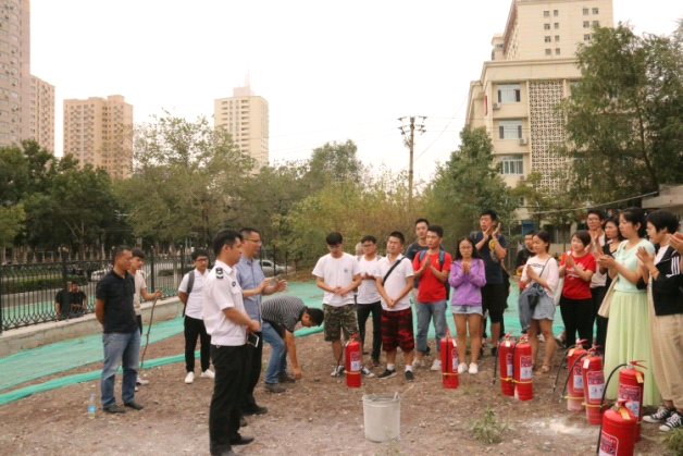 消防知識講座結(jié)束后,新疆生地所組織學生使用滅火器在室外開展了消防演練。